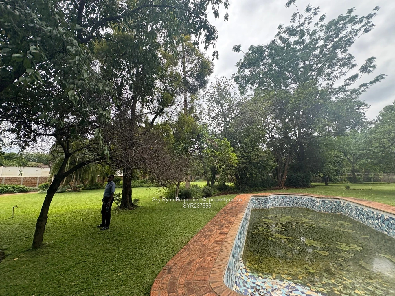 - Mature garden with tall trees and lush lawn