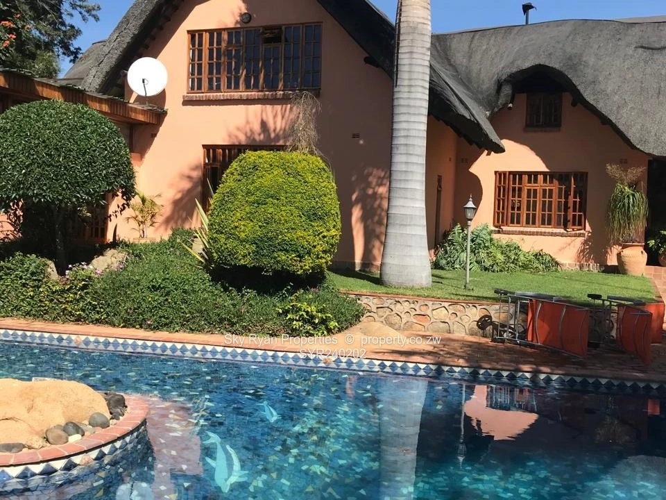 1. Main house, thatch under brick, comprising 5 double bedrooms all ensuite, 3 upstairs and 2 downstairs. Pyjama lounge & balcony. A fully fitted kitchen ,scullery and laundry room & walk in pantry. Entrance room, large lounge with wood burning fireplace, dining, sun lounge, patio, Triple lock up garage, storerooms, guest toilet downstairs, study,