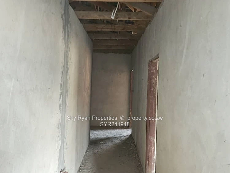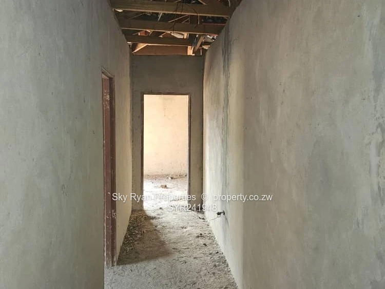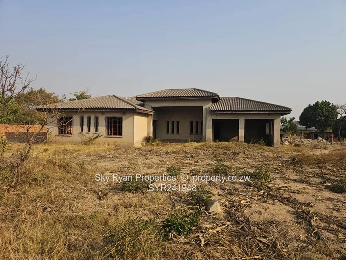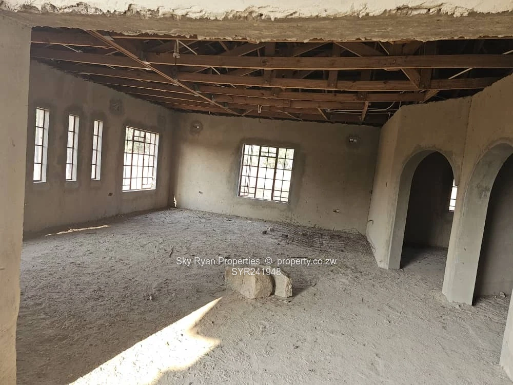 It's on 2600 sqmt the house has 4 bedrooms 2 with en suite 2 toilets with bathrooms combined kitchen and living/ dining, Scully,varenda , lockup garage for 2 cars, no ceiling, no floor, no window panes,no plumbing,no doors,380 sq meter floor area, orchard and roof leak on 2 spots